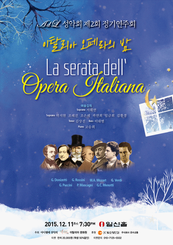 ‘이탈리아 오페라의 밤’을 개최하여, 오페라가 가장 활발하였던 벨칸토시대(1800년대)와 현대의 베리즈모시대(1900년대)의 이탈리아 오페라 아리아와 듀엣, 콰르텟 등 연주를 해설과 함께 이탈리아 오페라에 대해서 대중에게 더 심도있게 전달하는 음악회를 개최하고자 한다.