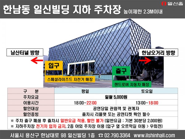 [일신홀] 찾아오는길 · 주차장이용안내 페이지 정보 작성자 일신홀 작성일19-11-26 14:38 조회27,490회 댓글0건 관련링크 이전글 다음글 목록 본문 [일신홀] 찾아오는길 · 주차장이용안내 이전글 다음글 목록